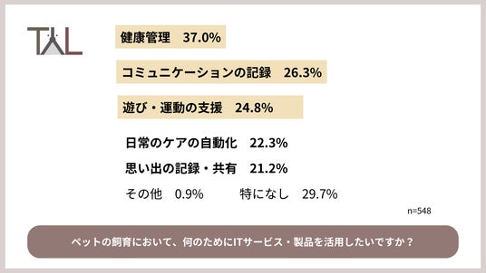 ペットの健康管理のためにITサービスを利用したい方が3割以上。コミュニケーションの記録や日常のケアなどさまざまな目的で需要が高まる。