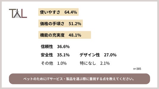 犬猫の飼い主385名に対し「 ペットのためにITサービス・製品を選ぶ際に重視する点を教えてください。」と質問したところ、「使いやすさ」(64.4%)、「価格の手頃さ」(51.2%)を求める回答が多く集まりました。そのほか、「機能の充実度」(48.1%)や、「信頼性」(36.6%)、「安全性」(35.1%)などを重視するという意見も。多くの観点から、サービスを検討したい飼い主の意向が見えました。
