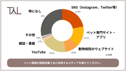 また、犬猫の飼い主548名に対し「ペット関連の情報収集で主に利用するメディアを教えてください。」と質問したところ、1位は「SNS(InstagramやXなど)」(21.9%)、2位「YouTube」(19.2%)、3位「ペット専門サイト・アプリ」(15.1%)という結果となり、多くの飼い主が、ペットに関する情報をSNSやWEBから取得していることが分かりました。