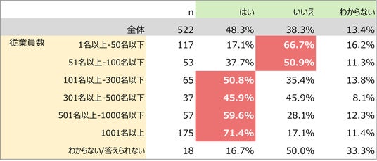 また、従業員数ごとに回答を分析すると、「実施している」が48.3%、「実施していない」が38.3%、「わからない」が13.4%という結果となりました。