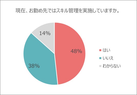 所属する会社でのスキル管理の実施状況を聞いたところ、「実施している」が48.3%、「実施していない」が38.3%、「わからない」が13.4%という結果となりました。