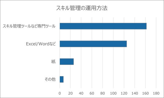 スキル管理を実施していると回答した方にその運用法について聞いたところ、「スキル管理ツールなど専門ツール」が66.2%、「Excel/Wordなど」が49.6%、「紙での運用」が10.3%、「その他」が2.8%という結果となりました。