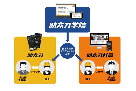 今後は「助太刀」や建設業特化の正社員採用サービス「助太刀社員」などの従来サービスとも連携を予定しております。例えば、「助太刀」アプリの利用者が「助太刀学院」で講座を受講すると、受講情報が職人のプロフィールに反映され、正確なスキルや経験として掲載でき、キャリアアップや新しい仕事の受注への繋がりに貢献します。また職人を探す工事会社は、信頼できる資格保有情報として判断が可能となり、現場に必要な人材のスムーズな確保を促進していきます。