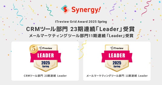 シナジーマーケティング株式会社(以下当社)は、当社が提供するクラウド型システム「Synergy!(シナジー)」がアイティクラウド株式会社(本社:東京都港区、代表取締役社長:黒野源太)運営のIT製品レビュープラットフォーム「ITreview(アイティレビュー)」において、満足度、認知度ともに優れた製品であると評価され「ITreview Grid Award 2025 Spring」CRMツールおよびメールマーケティングツール部門において最高位「Leader」を受賞したことをお知らせします。CRMツール部門における「Leader」受賞は23期連続、メールマーケティング部門では11期連続となります。