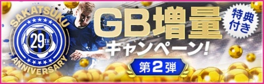 “SAKATSUKU Anniversary GB増量キャンペーン第2弾”を開催中です。GBショップで指定のGBセットを購入すると、特典としてGB増量やアイテムが付いてくるお得なキャンペーンです。