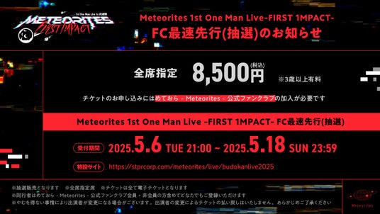 【特設サイト】https://stprcorp.com/meteorites/live/budokanlive2025【公演タイトル】『Meteorites 1st One Man Live -FIRST 1MPACT-』