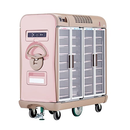 病院や高齢者施設で食事を運ぶためのカート。温かい食事は温かく、冷たい食事は冷たいまま配膳できるように、保温・保冷機能が備わった配膳車です。運ぶ人、食べる人、それを見守る人。ごはんだけでなく、笑顔もとどけたい。エレクターのこだわりから生まれた温冷配膳車です。