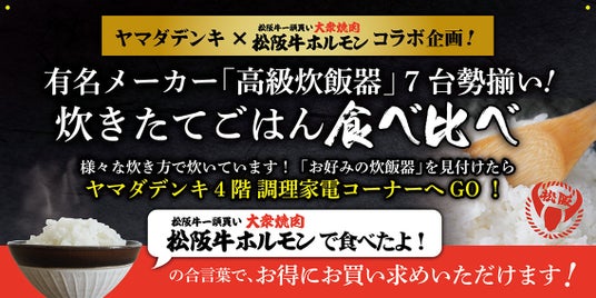 ヤマダデンキ様とのコラボ企画により、国内メーカーの高級炊飯器7台による炊きたてごはん食べ比べ放題を、550円(税込)にてご提供。あきたこまちや雪若丸など、季節ごとに仕入れる厳選国産米を様々な炊き方でお楽しみいただけます。さらに、お好みの炊飯器は、ヤマダデンキLABI4階の調理家電コーナーにてお得にお買い求めいただけます。