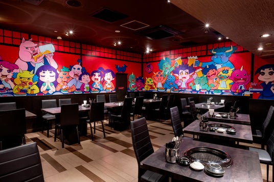 店内は主に2種類の異なる雰囲気のお席をご用意。掘りごたつ式の和モダン空間では、木のぬくもりと黒を基調としたシックな内装が、食事に集中できる落ち着いた雰囲気を演出。テーブル席エリアには、カラフルなポップアートが壁一面に描かれた個性的な空間も。赤を基調とした明るい雰囲気で、グループでのにぎやかな食事会にもぴったりです。