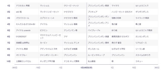 また、「ブリンバンバンボン」を検索した人がその前後にどのようなキーワードで検索していたかを調べたところ、「ハッピーセット」や子どもの病気、キッズ携帯などに関する検索が見られることから、小さい子どもや孫がいる人が検索している可能性が見て取れます。