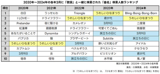 2024年にもっとも「歌詞」が検索された楽曲は「Bling-Bang-Bang-Born」 3月は、2022年から「うれしいひなまつり」や卒業に関する歌詞の検索が増加傾向