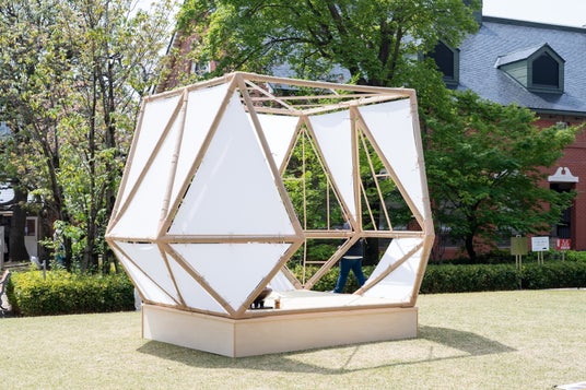 昨年12月に建築デザイン学部が学生を対象に実施した「千人茶会茶室 アイデアコンペティション」には、11作品の応募があり、建築デザイン学部 特別招聘教授の隈研吾氏が審査委員長として審査を行いました。今回は、上位4作品を実際に製作し、目白キャンパス内の泉プロムナードに設置。「invert」と「庵燈」では、それぞれ空間に合わせて「invert」には現代的な造形、「庵燈」には桜楓会に因んで桜と楓の意匠の古典的な茶道具が取り合わされて、実際に呈茶が行われました。
