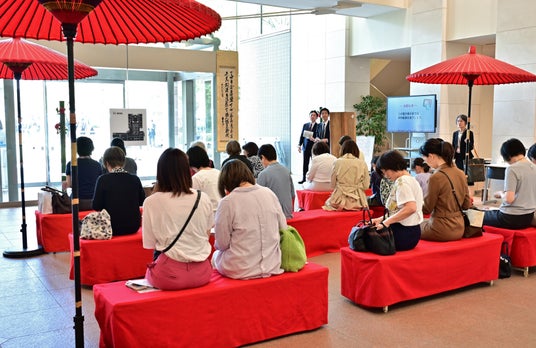 また、茶席を設けた百年館高層棟エントランスの正面に位置する泉プロムナードには、2024年4月に開設した建築デザイン学部による「千人茶会 茶室アイデアコンペティション」で選出された上位4作品を展示。そのうち2作品では実際に呈茶も行ない、本学が進めている大学改革によって開設した各新学部の学びをクロスさせた形として、その一端を来場者に感じていただきました。