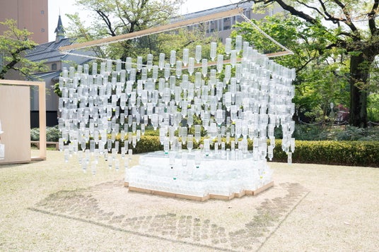 SDGsの観点から高さを変えてセットしたペットボトルで、枯山水のような波紋を表現。波紋は学問の広がりや人のつながりの象徴となっています。