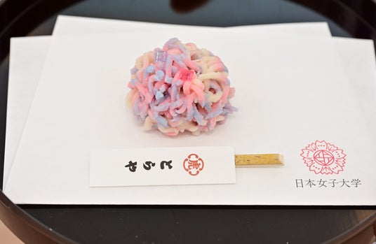 始まったばかりの新学部の真っ白な心意気を表す白、食科学科の学科カラーであり知的でクールさを表すブルー(海藻のスピルリナ)、そして栄養学科の学科カラーで、人とのコミュニケーションを大切にする心を表すピンク(ベニバナ)のそぼろが絡まりあう姿を“きんとん”で作りました。中にある求肥に包まれた黄色(クチナシ)の餡はこれからの明るい未来を表す太陽の光をイメージしています。