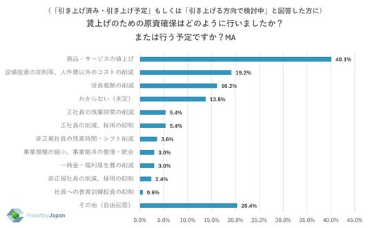 「引き上げ済み・引き上げ予定」もしくは「引き上げる方向で検討中」と回答した方に、賃上げのための原資確保はどのように行ったか、または行う予定か聞いたところ、「商品・サービスの値上げ」が40.1%、「設備投資の抑制等、人件費以外のコストの削減」が19.2%、「役員報酬の削減」が16.2%、「わからない(未定)」が13.8%、「正社員の削減、採用の抑制」「正社員の残業時間の削減」がそれぞれ5.4%、「非正規社員の残業時間・シフト削減」が3.6%、「一時金・福利厚生費の削減」「事業規模の縮小、事業拠点の整理・統合」がそれぞれ3.0%、「非正規社員の削減、採用の抑制」が2.4%、「社員への教育訓練投資の抑制」が0.6%、その他が20.4%だった。