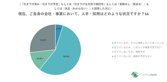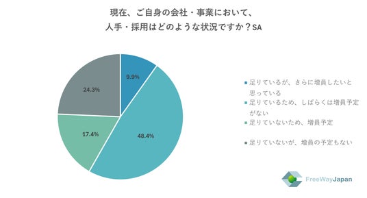現在、自身の会社・事業において、人手・採用はどのような状況か聞いたところ、「足りているため、しばらくは増員予定がない」が48.4%、「足りていないが、増員の予定もない」が24.3%「足りていないため、増員予定」が17.4%、「足りているが、さらに増員したいと思っている」が9.9%という結果だった。