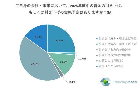 自身の会社・事業において、2025年度中の賃金の引き上げ、もしくは引き下げの実施予定はあるか聞いたところ、「変動なし(見送る)」が42.9%、「引き上げ済み・引き上げ予定」が24.8%、「未定(わからない)」が15.1%、「引き上げる方向で検討中」が13.5%、「引き下げる方向で検討中」が2.1%、「引き下げ済み・引き下げ予定」が1.6%という結果だった。