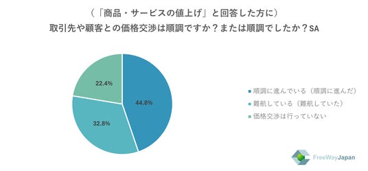 上記で「商品・サービスの値上げ」と回答した方に、取引先や顧客との価格交渉は順調か、または順調だったか聞いたところ、「順調に進んでいる(順調に進んだ)」のは44.8%、「難航している(難航していた)」が32.8%、「価格交渉は行っていない」が22.4%という結果だった。