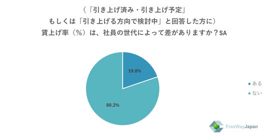 また、同様の対象者に賃上げ率(%)は、社員の世代によって差があるか聞いたところ、「ない」が80.2%、「ある」が19.8%だった。