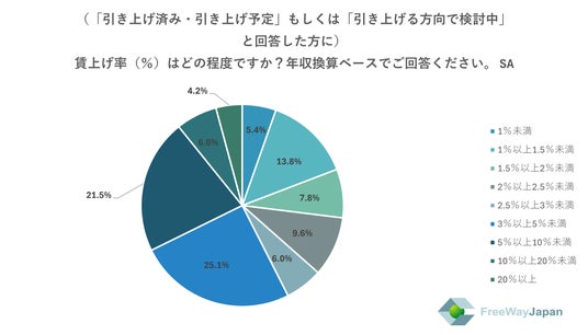 「引き上げ済み・引き上げ予定」もしくは「引き上げる方向で検討中」と回答した方に、賃上げ率(%)はどの程度か年収換算ベースで聞いたところ、「3%以上5%未満」が最多で25.1%、「5%以上10%未満」が21.5%、「1%以上1.5%未満」が13.8%、「2%以上2.5%未満」が9.6%、「1.5%以上2%未満」が7.8%と続いた。
