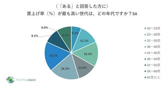 差が「ある」と回答した方に、賃上げ率(%)が最も高い世代は、どの年代か聞いたところ、「41~45歳」「46~50歳」がそれぞれ18.2%、「31~35歳」が15.2%、「23~30歳」が12.1%、「36~40歳」が12.0%、「51~55歳」「61歳以上」がそれぞれ9.1%、「16~22歳」が6.1%、「56~60歳」は0.0%という結果だった。