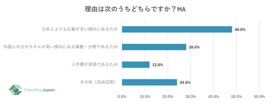 上記で「はい」と答えた方に、その理由を聞いたところ、最多は「日本人よりも応募が多い傾向にあるため」で48.0%、「外国人の方がスキルが高い傾向にある業種・分野であるため」が28.0%、「人件費が安価であるため」が12.0%、その他が24.0%だった。