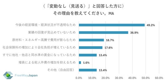 「変動なし(見送る)」と回答した方にもその理由を聞いたところ、「今後の経営環境・経済状況が不透明なため」が49.2%、「業績の回復が見込めていないため」が36.9%、「原材料・エネルギー高騰で費用が膨らむため」が18.7%、「社会保険料の増加により会社負担が増えているため」が17.6%、「すでに他社・他店と同水準の賃金になっているため」が13.4%、「増員による総人件費の増加を抑えるため」が1.6%、その他が13.4%という結果だった。