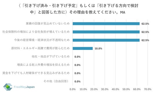 「引き下げ済み・引き下げ予定」もしくは「引き下げる方向で検討中」と回答した方にもその理由を聞いたところ、「今後の経営環境・経済状況が不透明なため」「社会保険料の増加により会社負担が増えているため」「業績の回復が見込めていないため」がそれぞれ62.5%、「原材料・エネルギー高騰で費用が膨らむため」が18.8%という結果だった。
