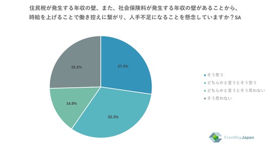 住民税が発生する年収の壁、また、社会保険料が発生する年収の壁があることから、時給を上げることで働き控えに繋がり、人手不足になることを懸念しているか聞いたところ、「どちらかと言うとそう思う」が32.3%、「そう思う」が27.3%、「そう思わない」が25.5%、「どちらかと言うとそう思わない」が14.9%という結果だった。