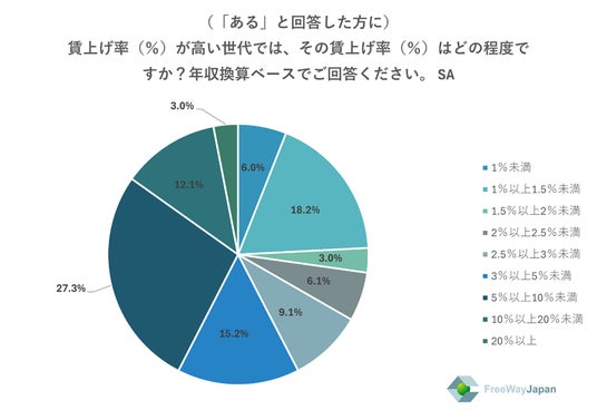 差が「ある」と回答した方に、賃上げ率(%)が高い世代では、その賃上げ率(%)はどの程度か聞いたところ、「5%以上10%未満」が最も多く27.3%、「1%以上1.5%未満」が18.2%、「3%以上5%未満」が15.2%、「10%以上20%未満」が12.1%、「2.5%以上3%未満」が9.1%と続いた。