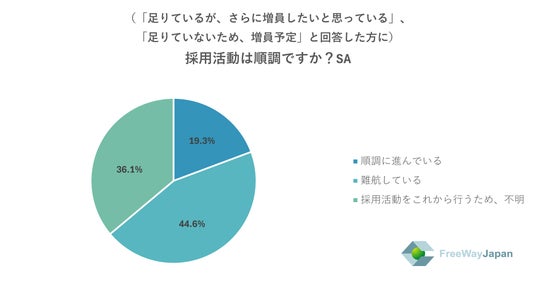 上記で「足りているが、さらに増員したいと思っている」、「足りていないため、増員予定」と回答した方に、採用活動は順調か聞いたところ、「難航している」が44.6%、「採用活動をこれから行うため、不明」が36.1%、「順調に進んでいる」が19.3%という結果だった。