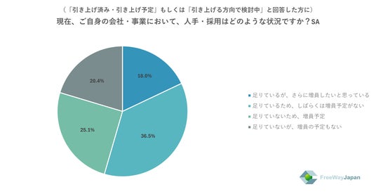 上記について、2025年度賃上げを行う(予定)の回答者において見ると、「足りているため、しばらくは増員予定がない」が36.5%、「足りていないため、増員予定」が25.1%、「足りていないが、増員の予定もない」が20.4%、「足りているが、さらに増員したいと思っている」が18.0%という結果だった。