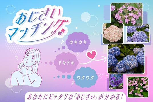 「今の気分」などいくつかの質問に答えることで、ここでしか見ることができないオリジナル品種やイチオシの品種をあなたの気分にあわせて紹介します。色も形も様々なあじさいのように、あなたも気分が変わる度、何度でもマッチングをお楽しみいただけます。