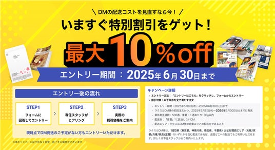 現時点でDM発送のご予定がない方でも、本日から2025年6月30日までにサイトよりエントリーいただければ2026年6月末までに発送される注文に適用が可能です。