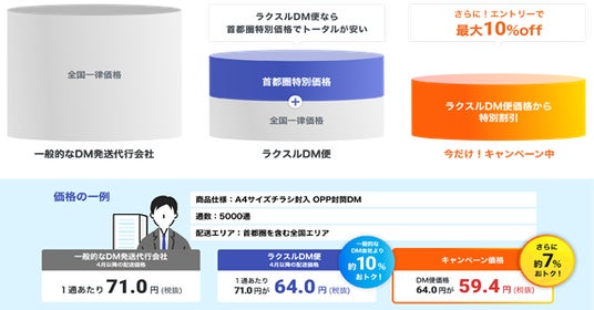 「ラクスルDM便」は、一都三県を含む全国へダイレクトメール(DM)を発送するお客様向けに、従来価格より 10%のコストダウンを実現した印刷+配送コスト1通56.1円にて印刷から配送までをワンストップで提供する配送プランとして2025年3月3日にサービスを開始しました。