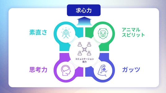 コズムのバリューは、「素直さ」「思考力」「ガッツ」「アニマルスピリット」の4つのコアバリューを軸に構成されています。