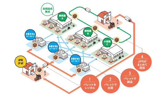 JPRは、「パレット輸送」を実現するサービスを提供しています。標準規格のパレットを企業に代わって保有し、全国に配置されたパレットデポから供給しています。また、届け先に輸送した後の空パレットを利用企業自らが回収するのではなく、卸売業・小売業の物流センターなどからJPRがまとめて回収する「共同回収システム」を全国で展開しています。