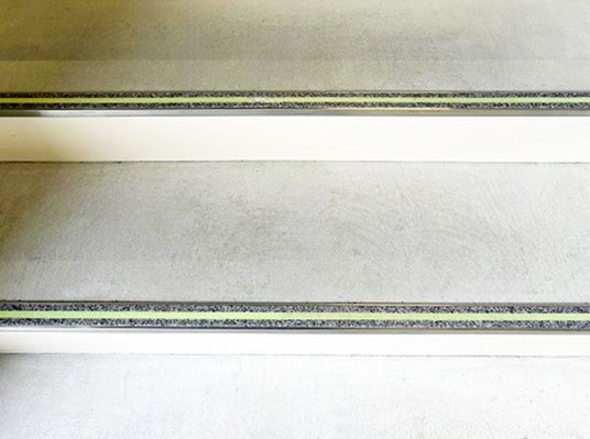 - アンプロップ製品(屋外階段・踊り場)蓄光部分は視認性良好、防滑性能も高く、雨天時でも滑らず安心。