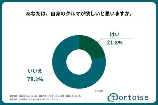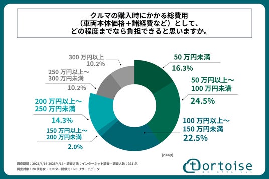 株式会社トータス(本社:神奈川県大和市、代表取締役:村野 公紀)が運営する「tortoise」は、20代の男女を対象に「20代のクルマの購入費・維持費に関する実態調査」を実施しました。この調査結果から、20代のクルマの購入費・維持費への意識や実態などが明らかになりました。