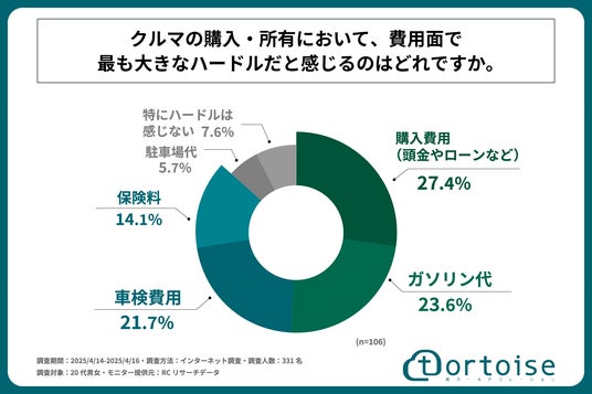 自身のクルマを所持している20代の男女の多くが、クルマの購入・所有において、費用面で最も大きなハードルだと感じるものも「購入費」