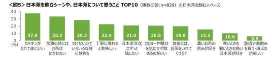 日本茶を飲むシーンや、日本茶について思うことは「カテキンがとれて体にいい」「食事の時にお茶はかかせない」「甘くないのでいろいろな時に飲める」がTOP3で、健康面や飲用シーンの幅広さが評価されている。<図5>