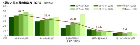 日本茶の飲み方は、「ペットボトルのお茶」が42.7%と最多、「ティーバッグを使う」が33.8%で続く。