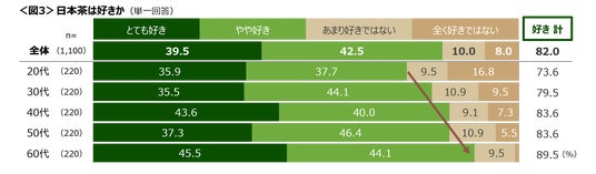 日本茶が好きな人は82.0%で、「とても好き」は39.5%。
