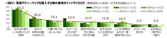 茶葉やティーバッグを購入する際の重視するポイントは、「定番でいつも買っている銘柄」が42.3%でTOP。