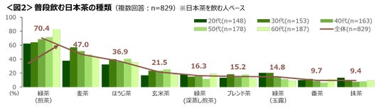 普段飲む日本茶の種類は、「緑茶(煎茶)」が70.4%と断トツ。「麦茶」「ほうじ茶」が3~4割台。