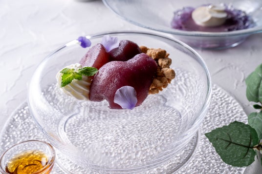 コースを締めくくるのは、紫色のプティフール。まるで芸術品のような美しいスミレ色のスイーツの数々を、埠頭に建つホテルで心ゆくまでお楽しみください。