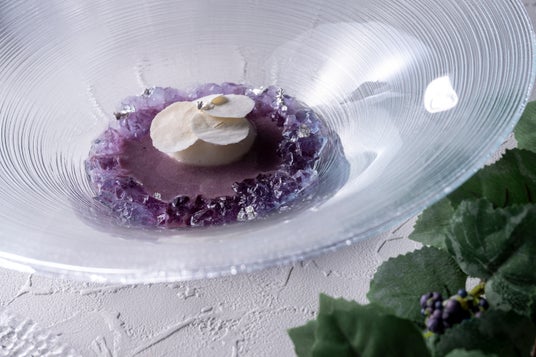 巨峰とヨーグルトのスープ仕立て バタフライピーのジュレを添えて