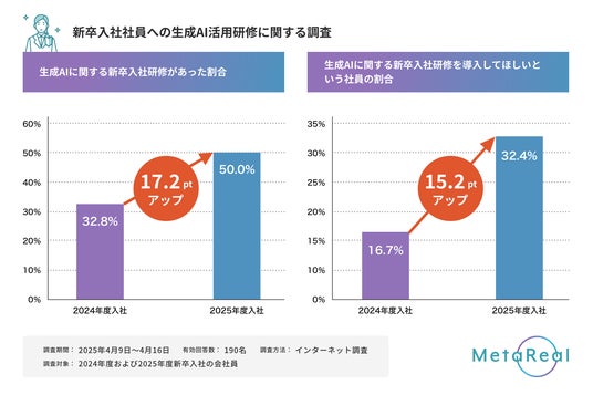 【AIエージェント元年の2025年】2025年度新入社員への生成AI研修は約5割が導入生成AI研修を求める声は昨年に比べ15.2ポイント増<メタリアル 白書>
