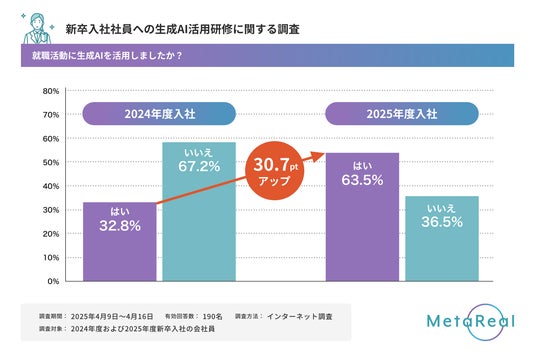 株式会社メタリアル(本社:東京都千代田区、代表取締役:五石 順一)は、今年2025年は「AIエージェント元年」と呼ばれるように年々生成AI導入への関心が高まる中、2024年度入社と2025年度入社の新卒入社社員へ生成AI活用研修に関する調査を実施しました。調査の結果、生成AIに関する研修を実施している企業は約4割、そのうち研修の内容は業務効率化に関するものが約7割であることがわかりました。また、2025年度単年での研修導入率は5割に上り、前年(2024年度)に比べ17.2ポイント増加していたことがわかりました。就職活動での生成AI活用については、2025年度入社者は2024年度入社者 よりも30.7ポイント高く、積極的に生成AIを活用していたことがわかりました。